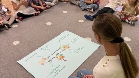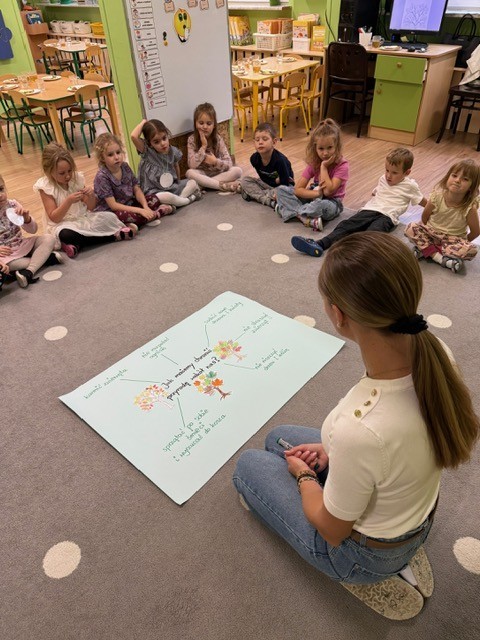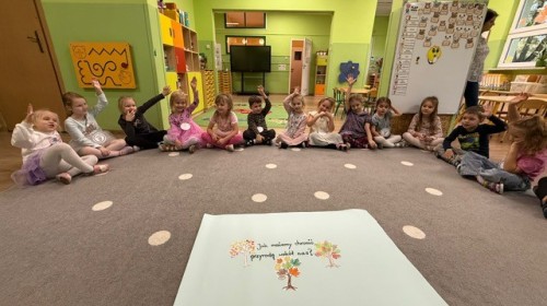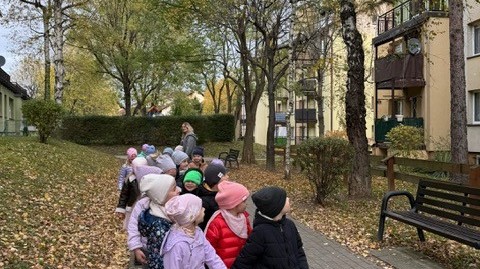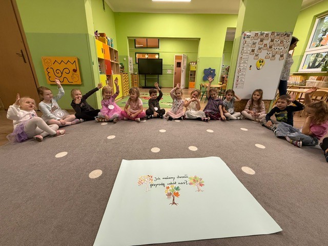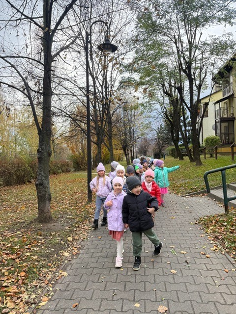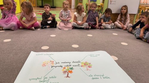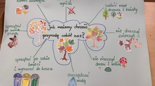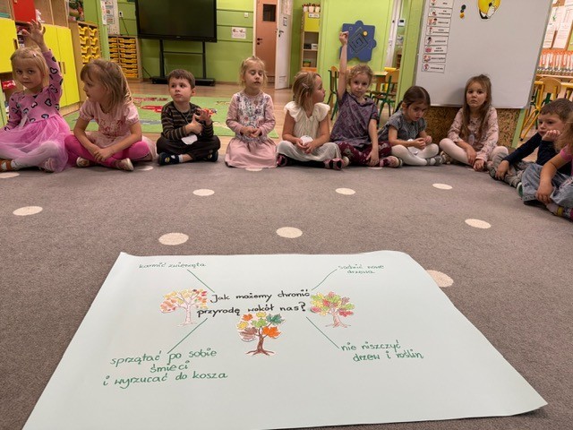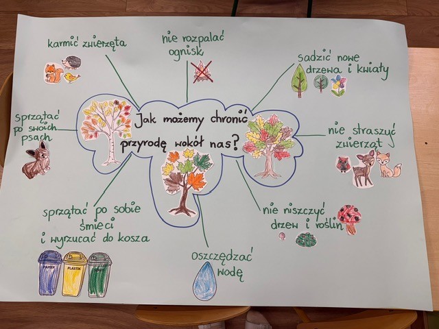W ramach działania ekologicznego nasze przedszkolaki z grupy „Niedźwiadki” wybrały się na spacer edukacyjny po alejkach znajdujących się w okolicy przedszkola. Celem wyjścia było poznanie różnych gatunków drzew rosnących w naszej okolicy oraz uwrażliwienie dzieci na piękno i znaczenie przyrody w najbliższym otoczeniu. Po powrocie do przedszkola odbyła się „burza mózgów” i dzieci dzieliły się swoimi pomysłami jak można dbać i chronić przyrodę wokół nas, np.: sadzić nowe drzewa i kwiaty, nie niszczyć drzew i roślin, sprzątać po sobie śmieci i wyrzucać do kosza, oszczędzać wodę, karmić zwierzęta. Nauczycielka spisała pomysły dzieci na dużym arkuszu papieru, a następnie dzieci ozdobiły plakat kolorowymi obrazkami.