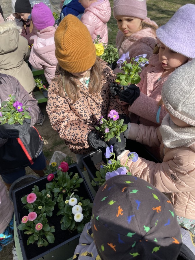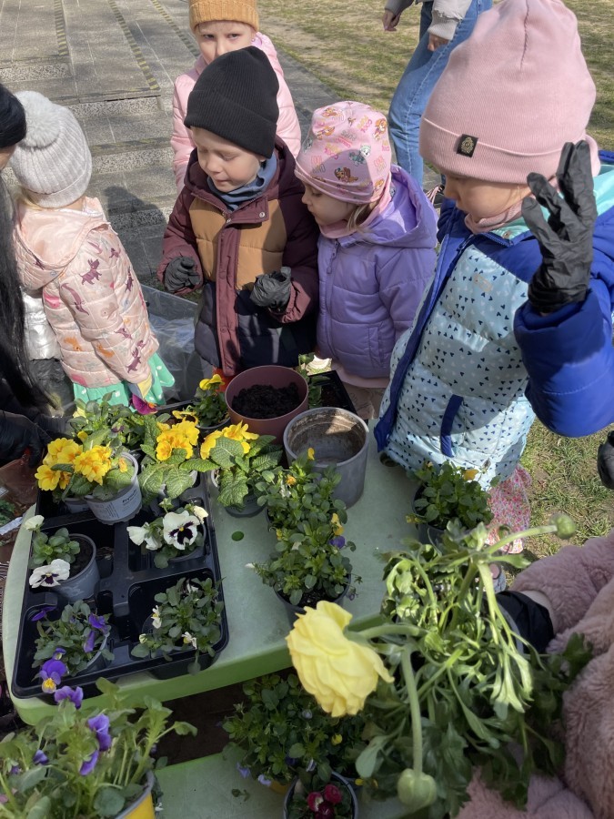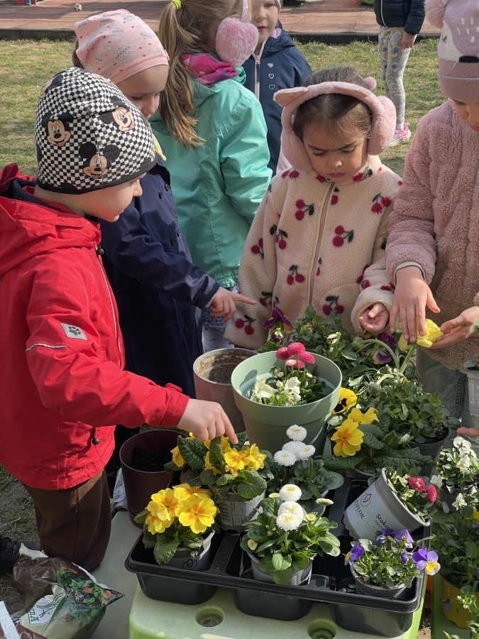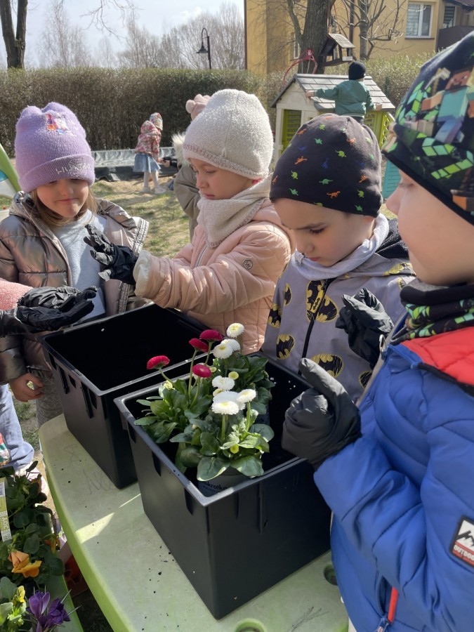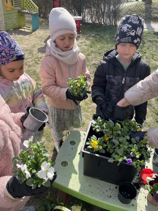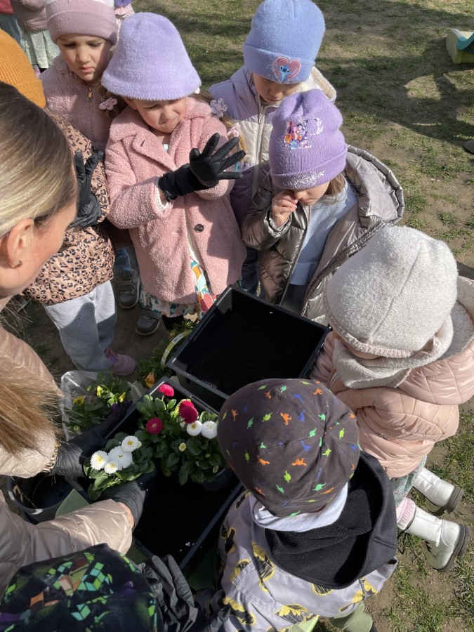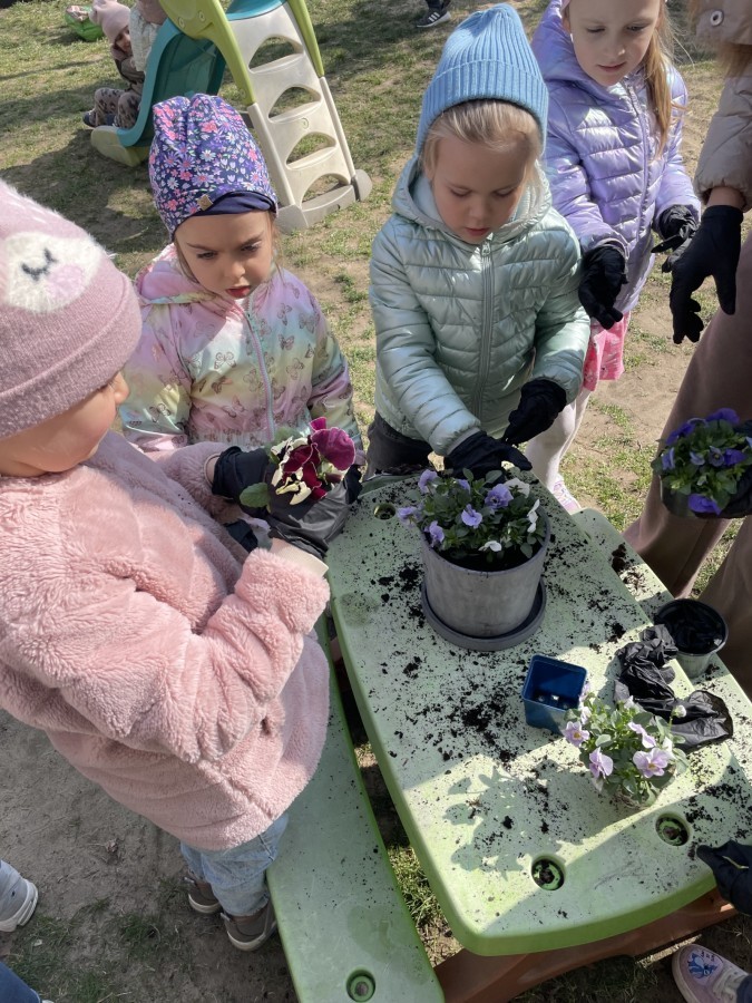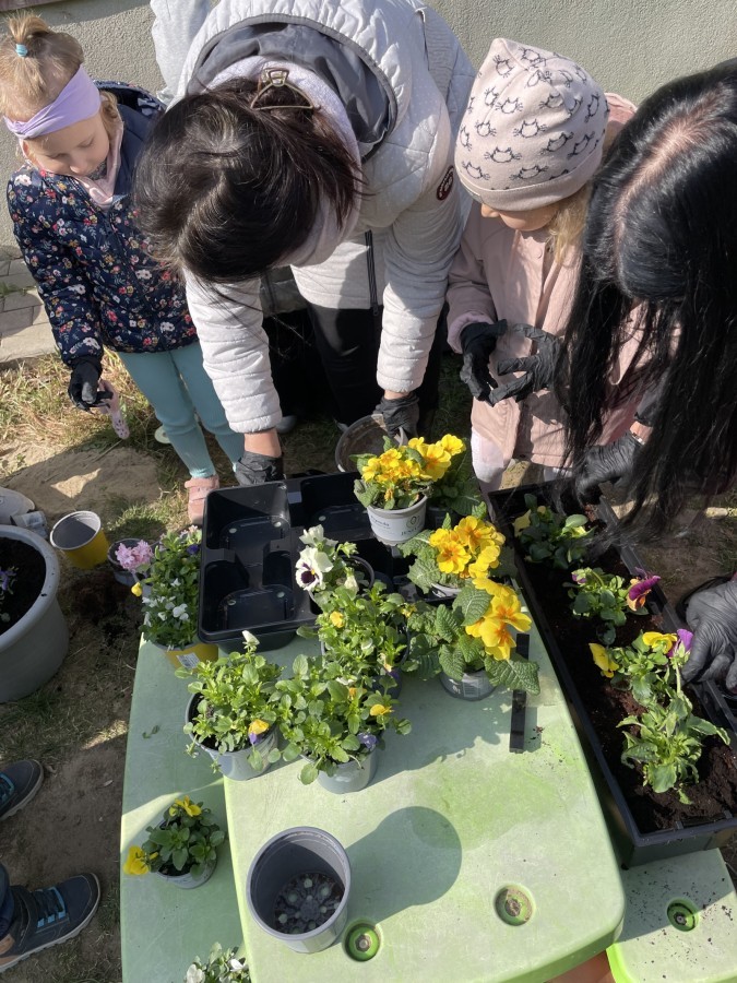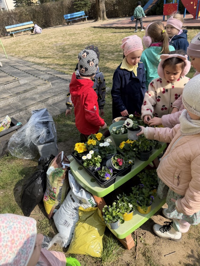 Następnie dzieci przeszły do działań praktycznych. Przedszkolaki z wielkim zaangażowaniem sadziły nowe rośliny: bratki, pierwiosnki, stokrotki ogrodowe, hiacynty, truskawki oraz zioła do doniczek, które teraz zdobią wejście do przedszkola oraz przedszkolny ogródek. Była to świetna okazja do nauki poprzez działanie - przedszkolaki mogły samodzielnie posadzić rośliny i dowiedzieć się, jak należy o nie dbać. Serdecznie dziękujemy Rodzicom za zaangażowanie i przyniesienie potrzebnych rzeczy do sadzenia podczas naszego wiosennego Eko-wydarzenia. Dzięki Państwa wsparciu dzieci mogły z radością uczestniczyć w tej wyjątkowej, zielonej przygodzie i uczyć się troski o naturę.