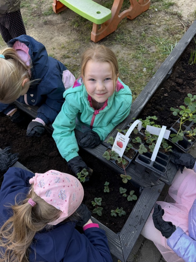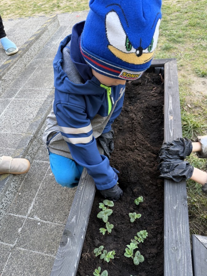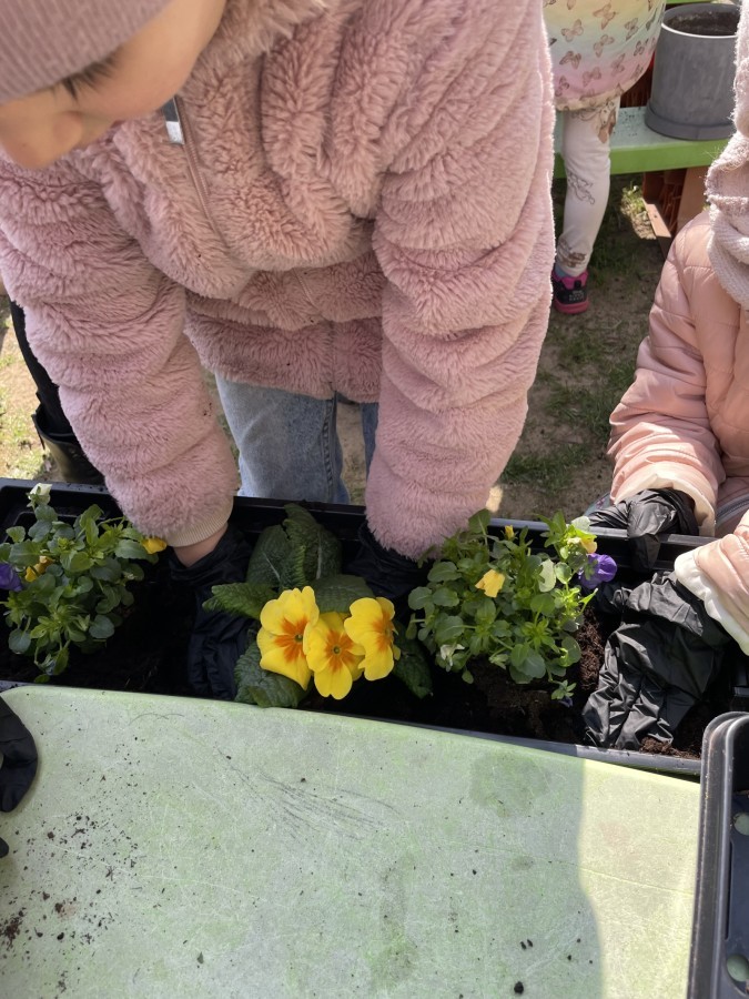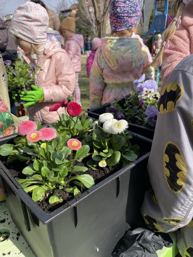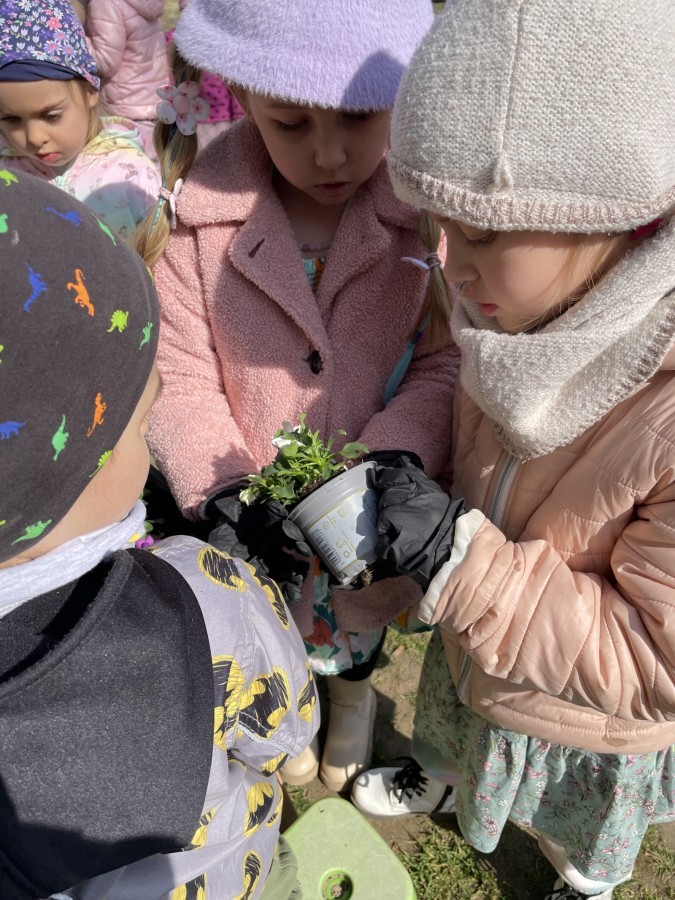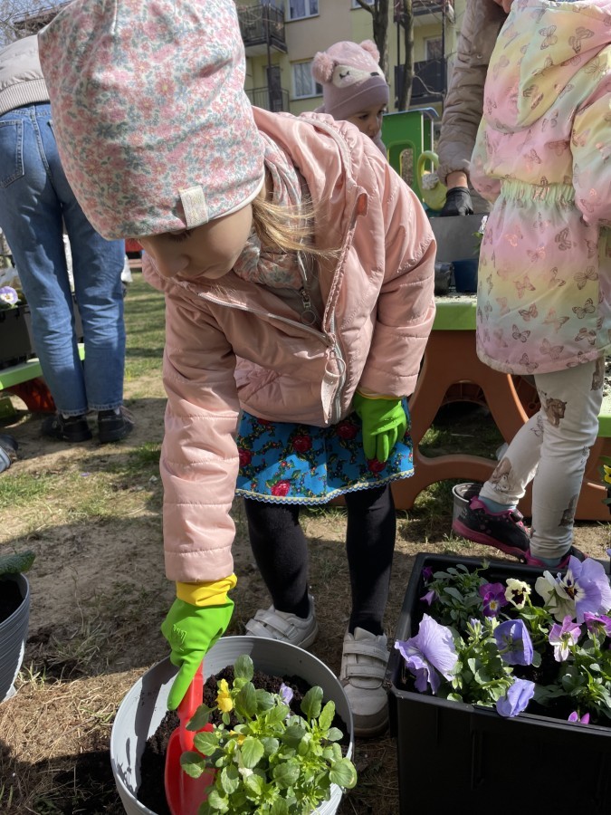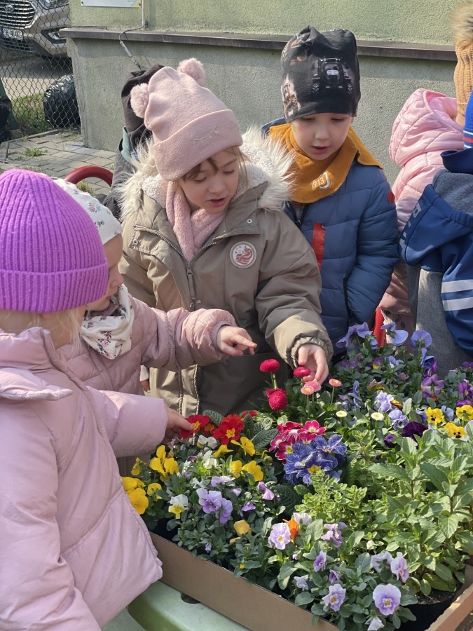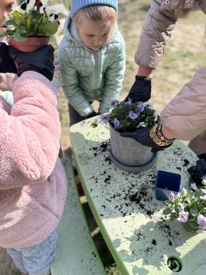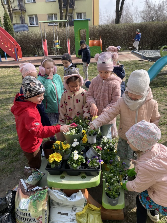 Następnie dzieci przeszły do działań praktycznych. Przedszkolaki z wielkim zaangażowaniem sadziły nowe rośliny: bratki, pierwiosnki, stokrotki ogrodowe, hiacynty, truskawki oraz zioła do doniczek, które teraz zdobią wejście do przedszkola oraz przedszkolny ogródek. Była to świetna okazja do nauki poprzez działanie - przedszkolaki mogły samodzielnie posadzić rośliny i dowiedzieć się, jak należy o nie dbać. Serdecznie dziękujemy Rodzicom za zaangażowanie i przyniesienie potrzebnych rzeczy do sadzenia podczas naszego wiosennego Eko-wydarzenia. Dzięki Państwa wsparciu dzieci mogły z radością uczestniczyć w tej wyjątkowej, zielonej przygodzie i uczyć się troski o naturę.