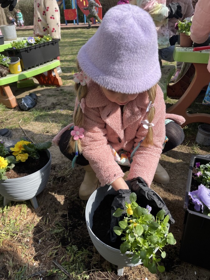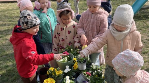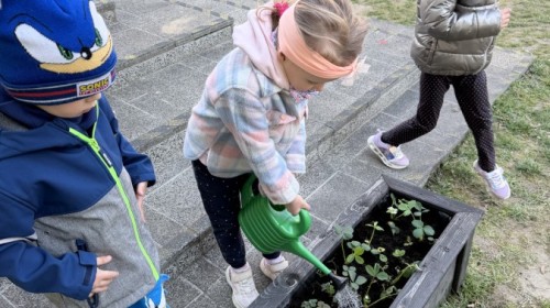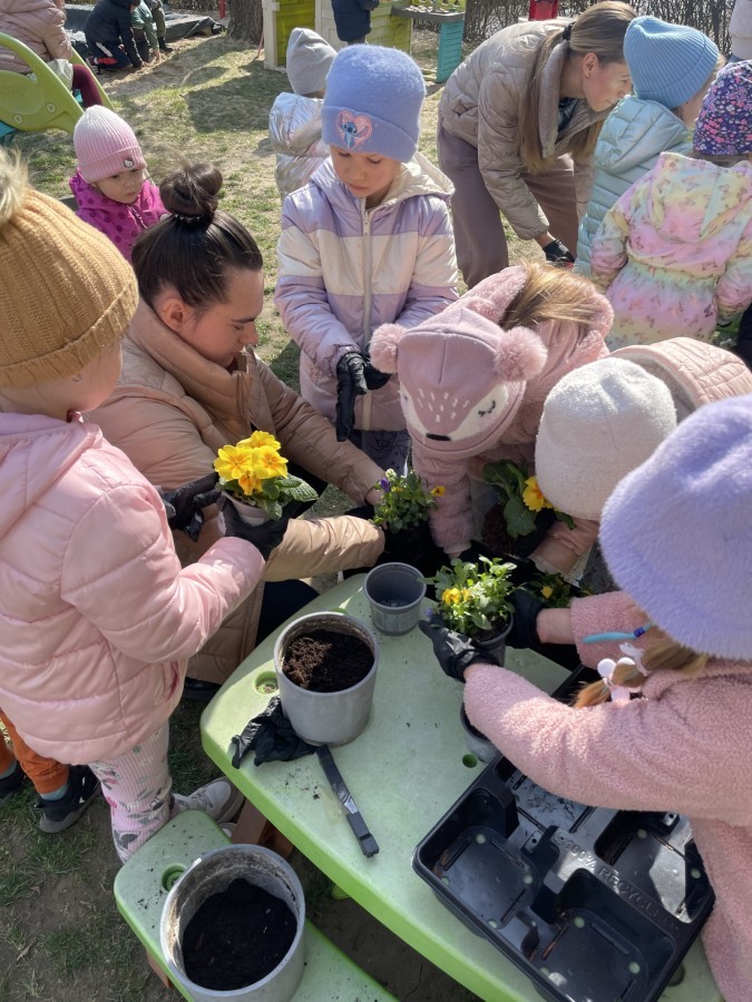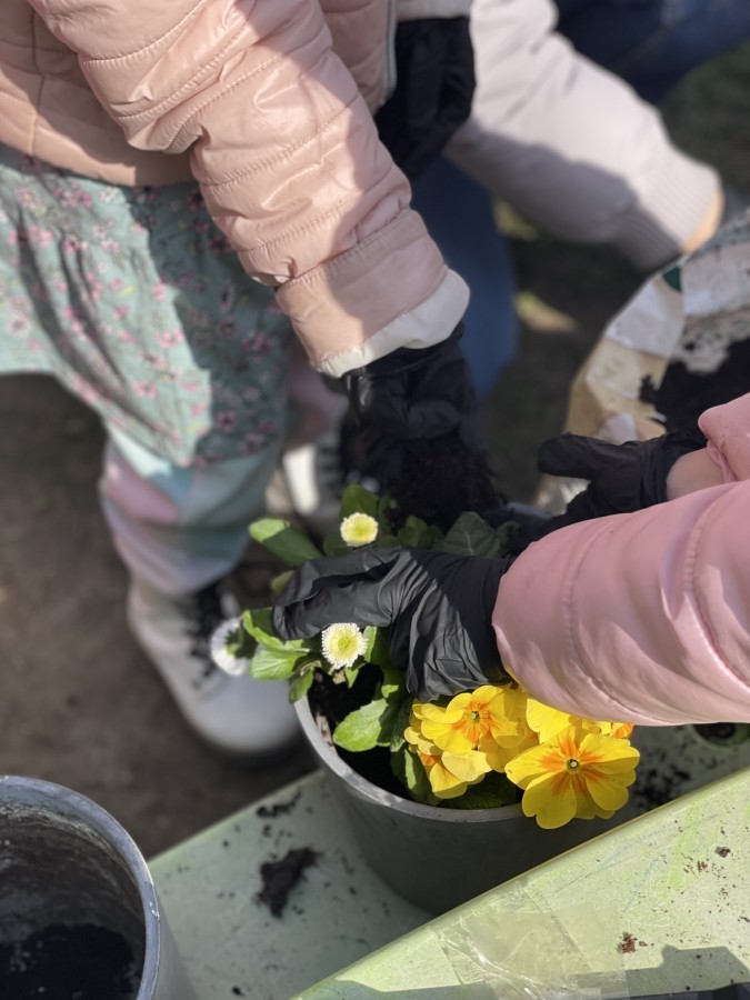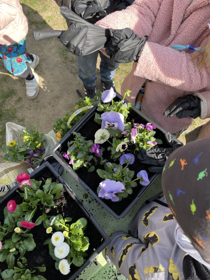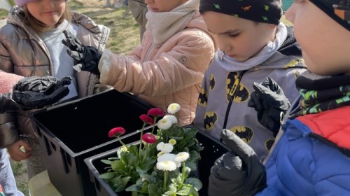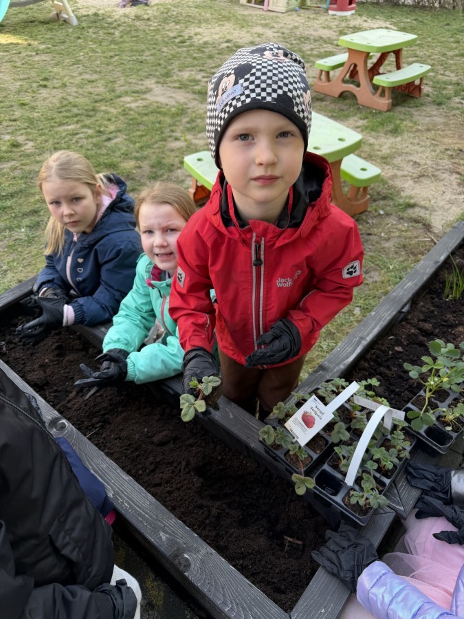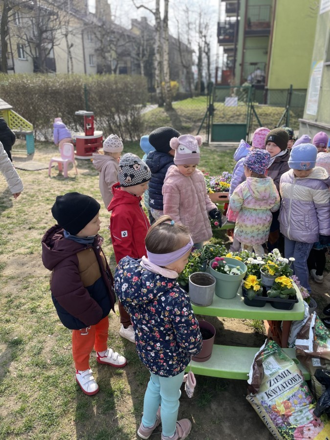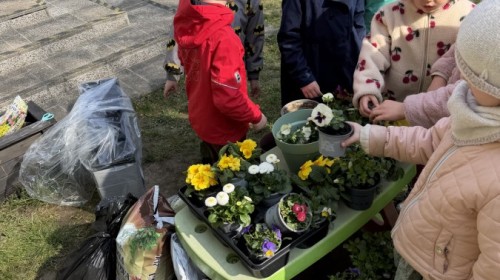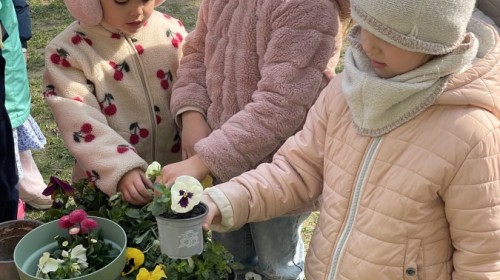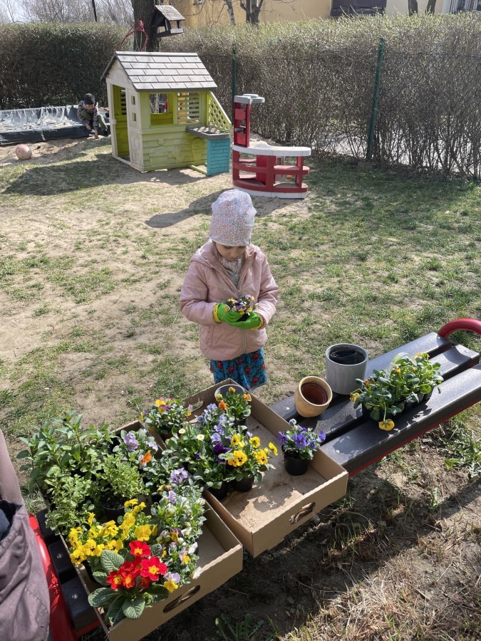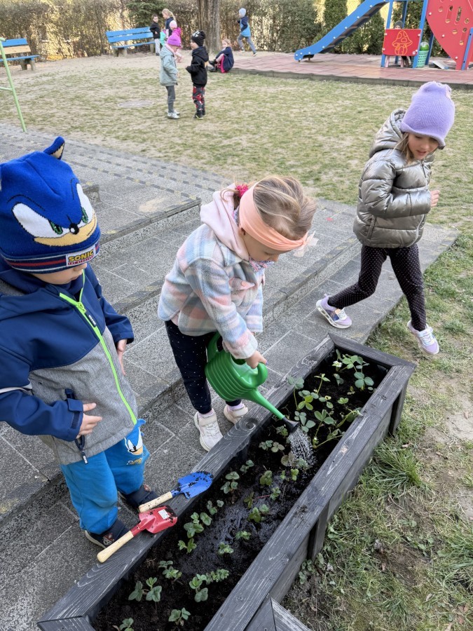 Następnie dzieci przeszły do działań praktycznych. Przedszkolaki z wielkim zaangażowaniem sadziły nowe rośliny: bratki, pierwiosnki, stokrotki ogrodowe, hiacynty, truskawki oraz zioła do doniczek, które teraz zdobią wejście do przedszkola oraz przedszkolny ogródek. Była to świetna okazja do nauki poprzez działanie - przedszkolaki mogły samodzielnie posadzić rośliny i dowiedzieć się, jak należy o nie dbać. Serdecznie dziękujemy Rodzicom za zaangażowanie i przyniesienie potrzebnych rzeczy do sadzenia podczas naszego wiosennego Eko-wydarzenia. Dzięki Państwa wsparciu dzieci mogły z radością uczestniczyć w tej wyjątkowej, zielonej przygodzie i uczyć się troski o naturę.