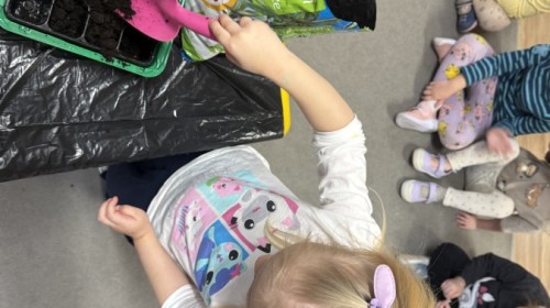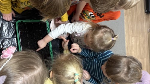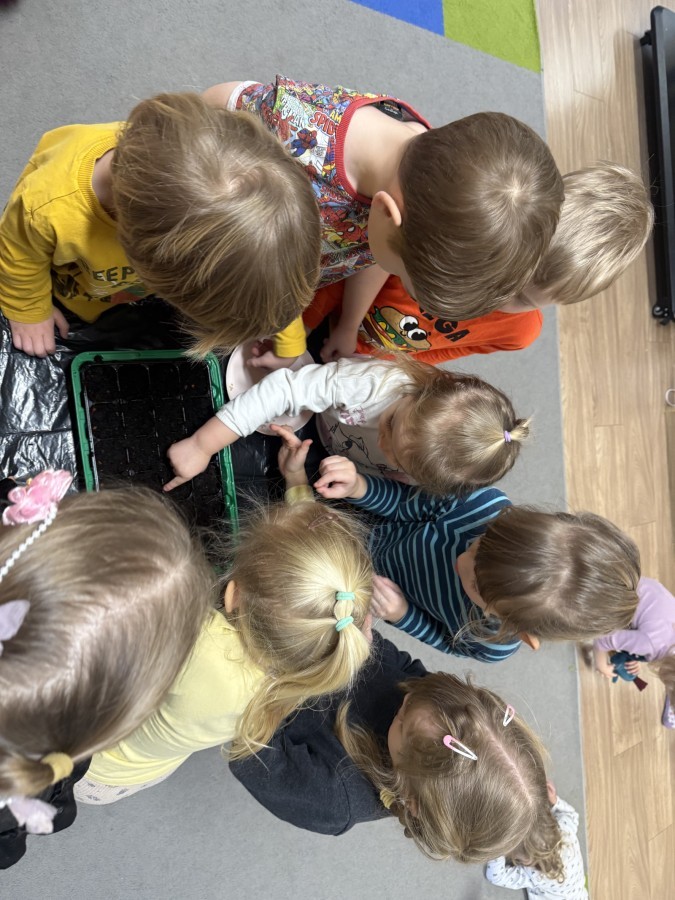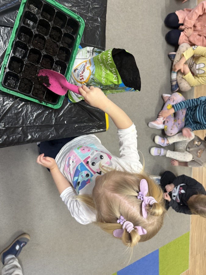 W ramach działania ogrodniczego dzieci wspólnie wysiały nasionka papryki, które obecnie pielęgnują i obserwują w sali przedszkolnej. To dopiero początek naszej ogrodniczej drogi - przez kolejne tygodnie przedszkolaki będą regularnie dbać o rośliny, podlewać je oraz uważnie obserwować ich rozwój aż do początku wiosny.