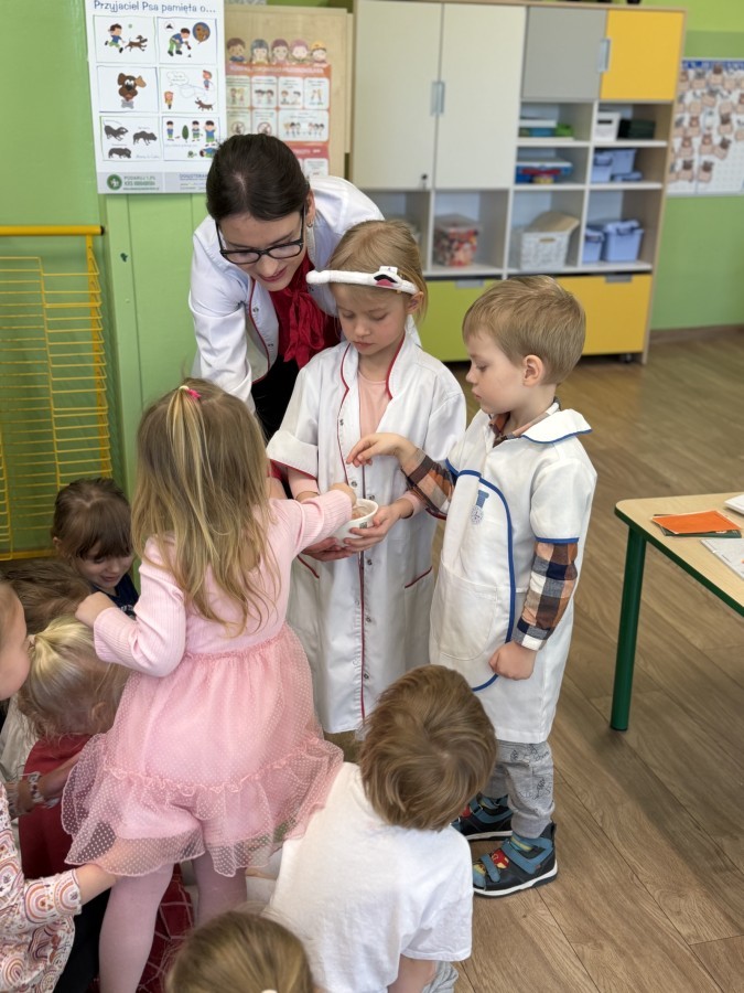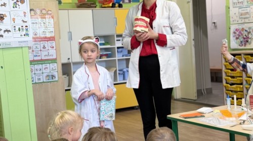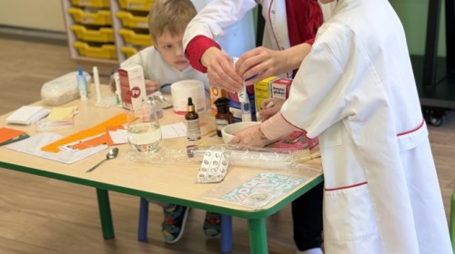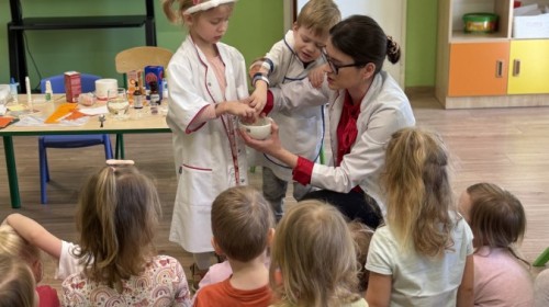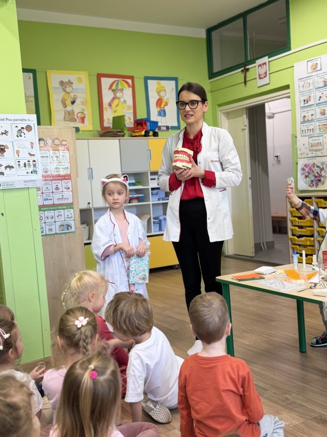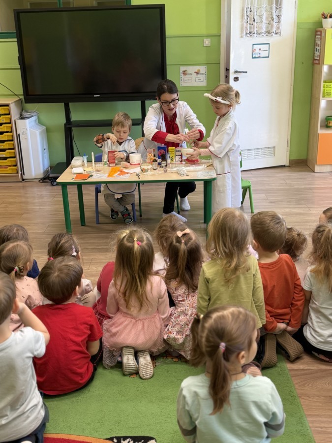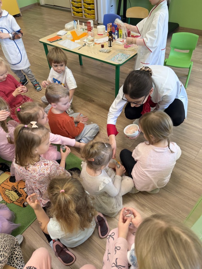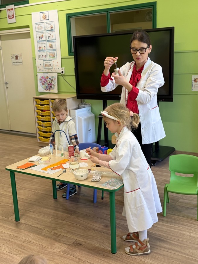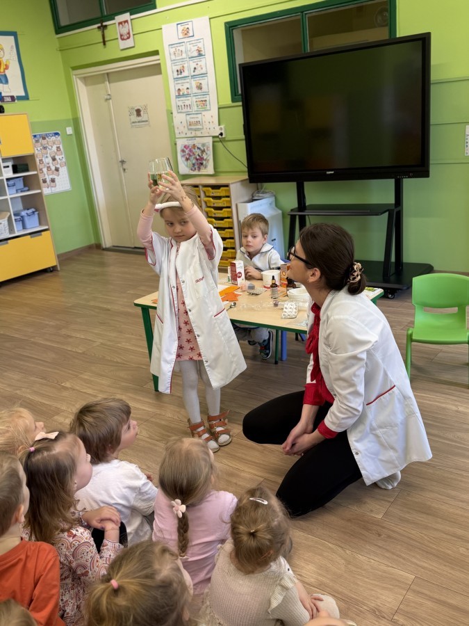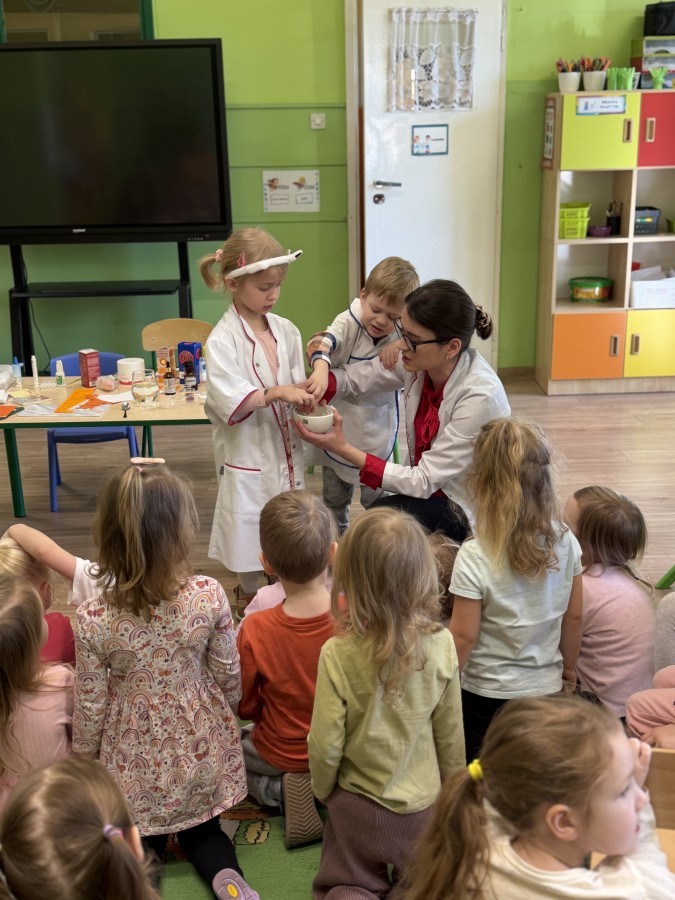 Nasze przedszkole odwiedziła Mama Julii i Maksymiliana, Pani Natalia, aby opowiedzieć dzieciom o pracy w aptece. Na początku wyjaśniła, jakie leki można kupić w aptece oraz jak ważne jest bezpieczne korzystanie z lekarstw. Następnie farmaceutka zaprezentowała kilka eksperymentów związanych z lekami. Dzieci z dużym zainteresowaniem obserwowały doświadczenia i chętnie brały w nich udział.