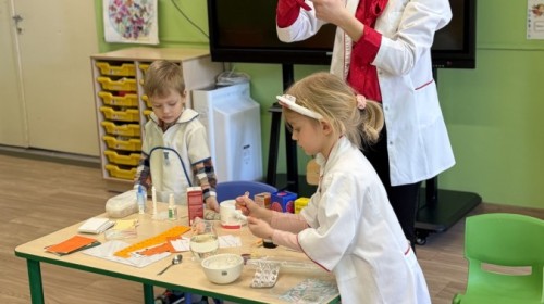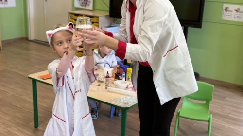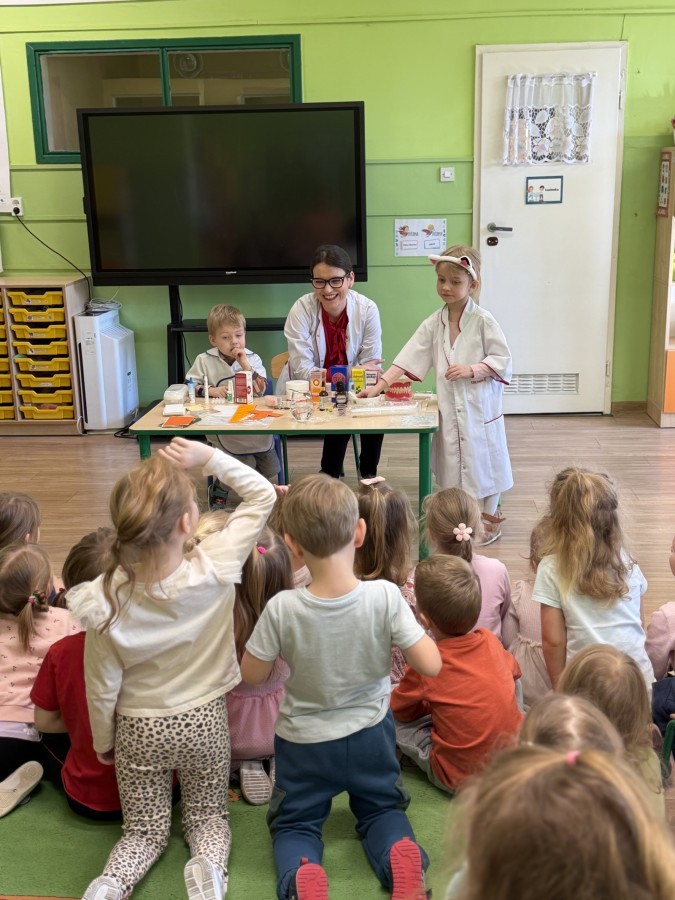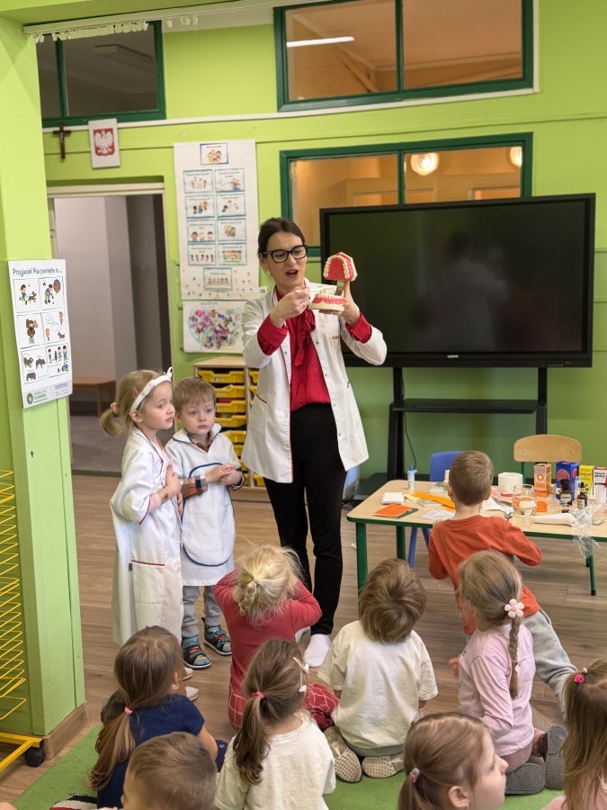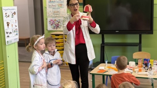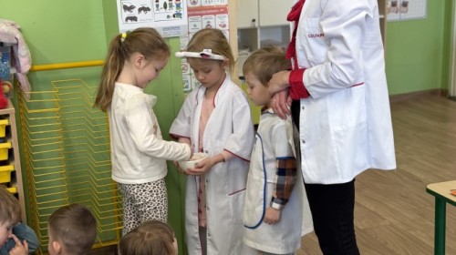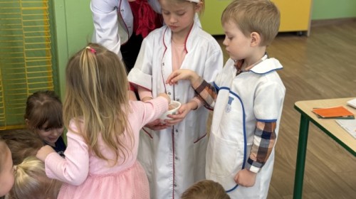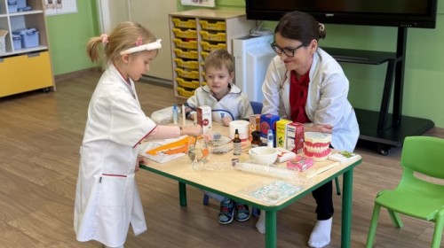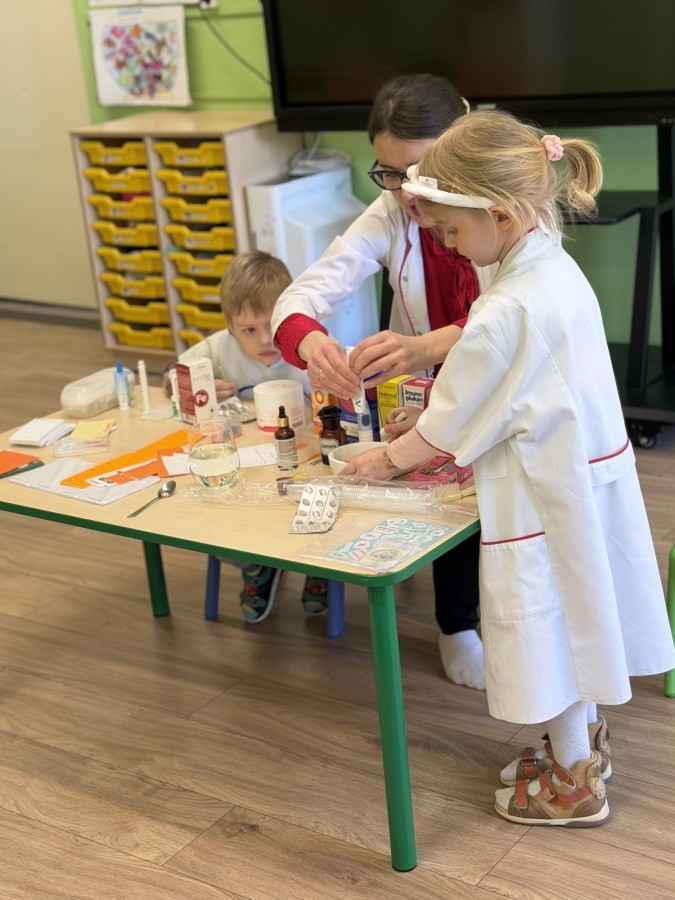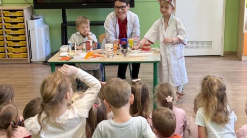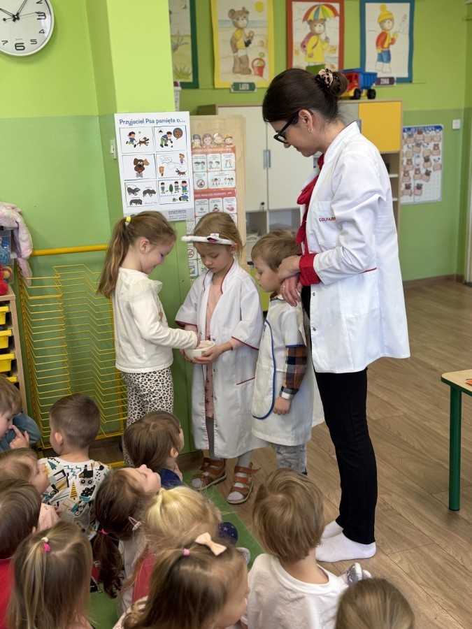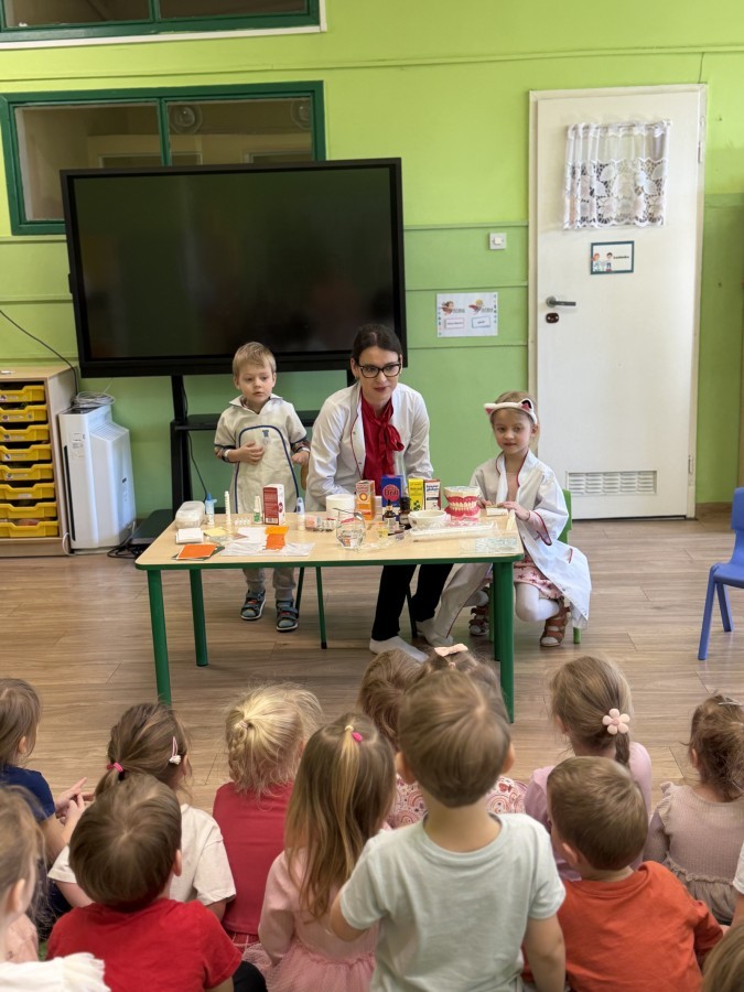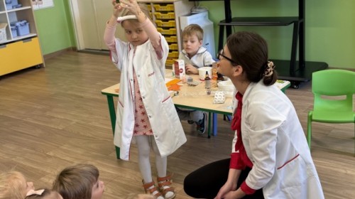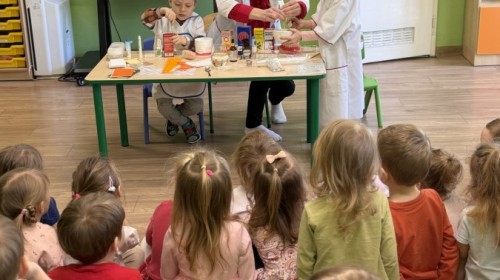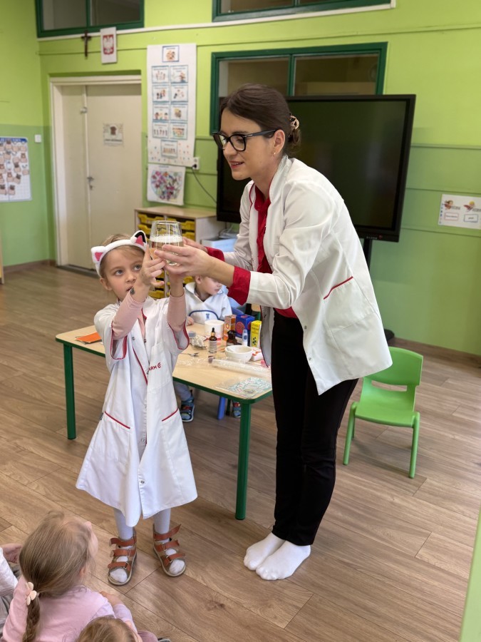 Nasze przedszkole odwiedziła Mama Julii i Maksymiliana, Pani Natalia, aby opowiedzieć dzieciom o pracy w aptece. Na początku wyjaśniła, jakie leki można kupić w aptece oraz jak ważne jest bezpieczne korzystanie z lekarstw. Następnie farmaceutka zaprezentowała kilka eksperymentów związanych z lekami. Dzieci z dużym zainteresowaniem obserwowały doświadczenia i chętnie brały w nich udział.