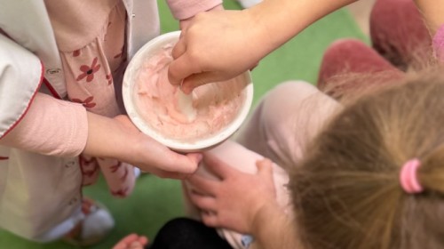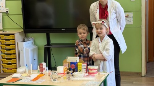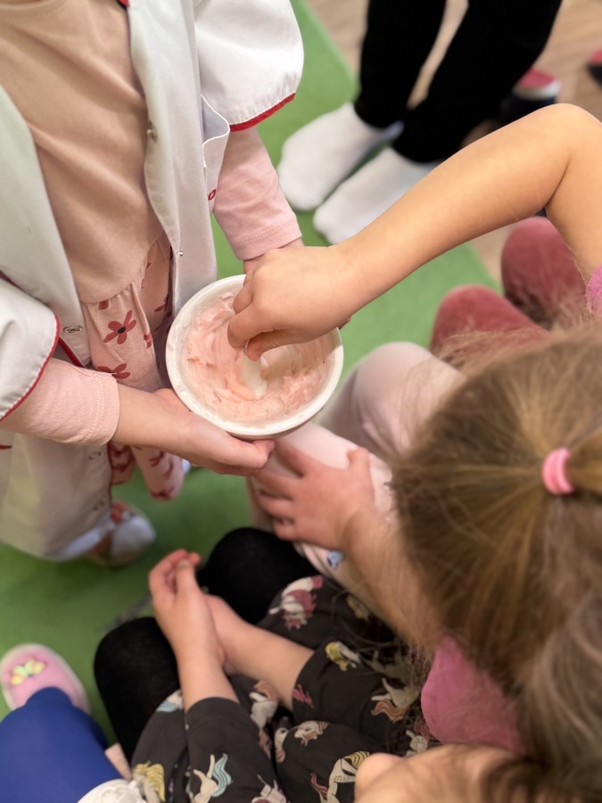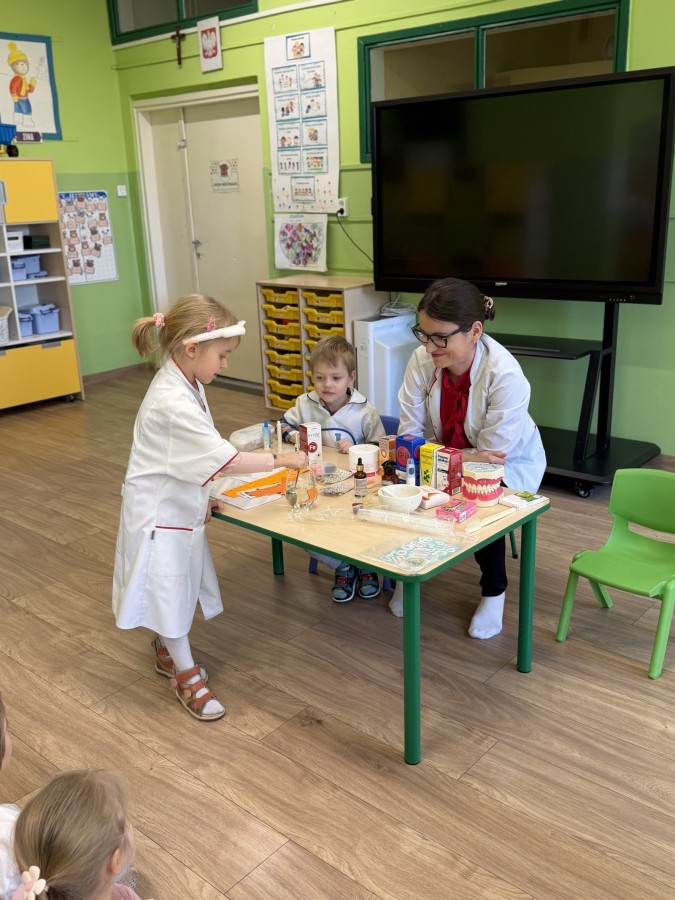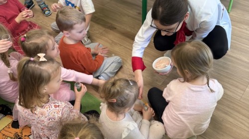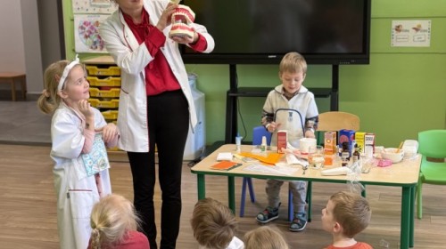 Największą atrakcją było wspólne przygotowywanie maści. Każde dziecko mogło zobaczyć, z jakich składników powstaje maść i samodzielnie ją wymieszać. Następnie każdy dostał maść do małego pojemniczka, aby zobaczyć efekt końcowy oraz rozsmarować ją na rękach. Przedszkolaki dowiedziały się także, jak powinniśmy myć zęby i mogły spróbować prawidłowego szczotkowania na modelu sztucznej szczęki.