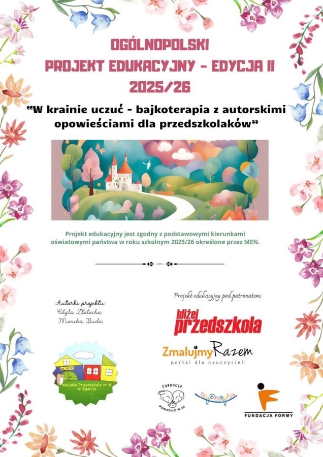 Projekt realizowany jest od października 2025 r. do maja 2026 r. i ma na celu wspieranie rozwoju emocjonalnego dzieci w wieku przedszkolnym poprzez bajkoterapię i twórcze działania inspirowane autorskimi opowieściami.