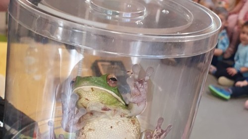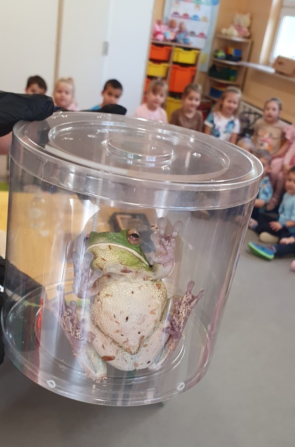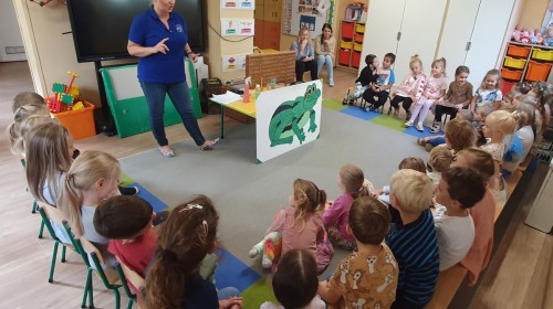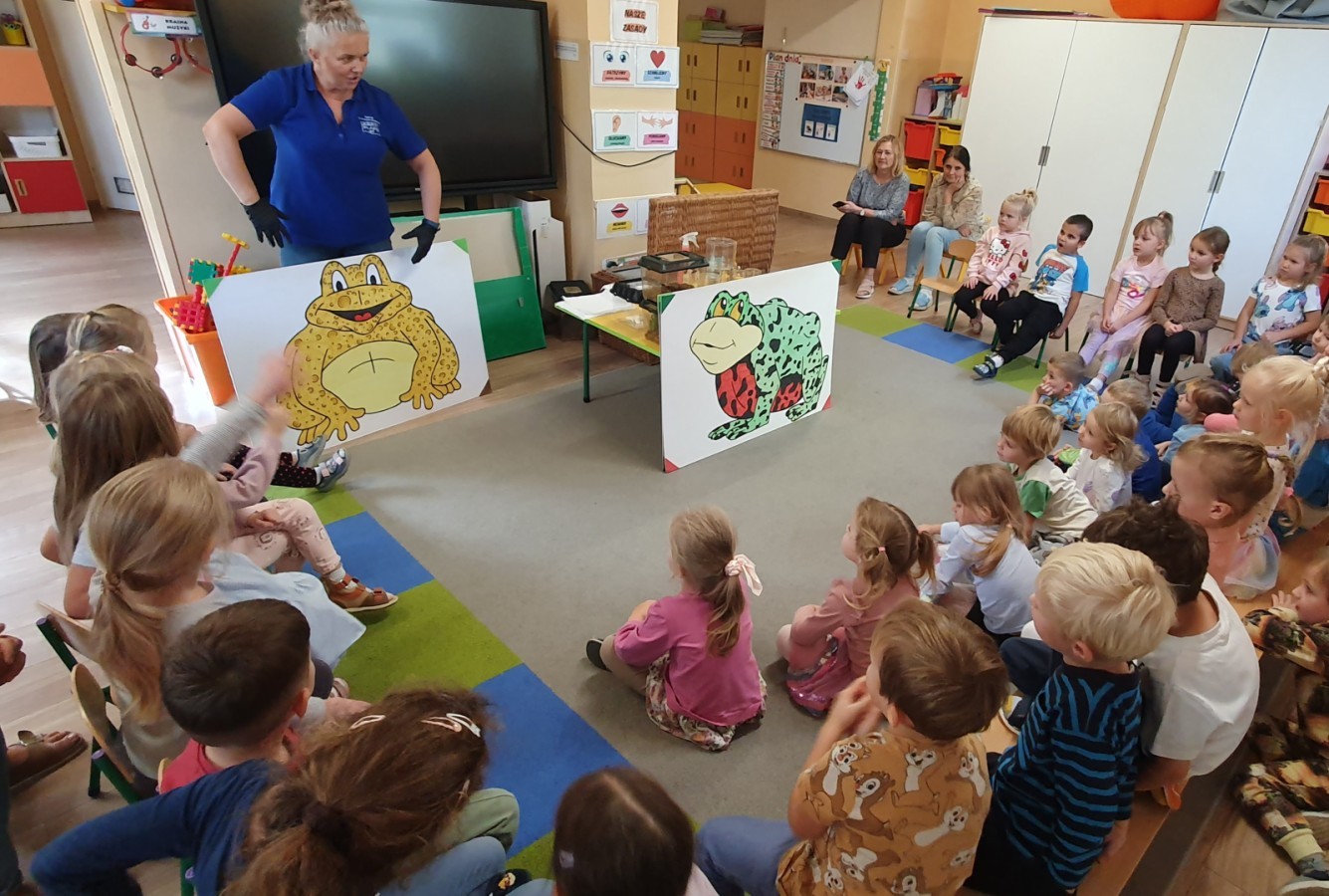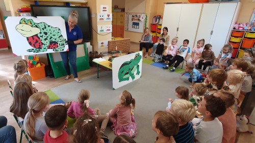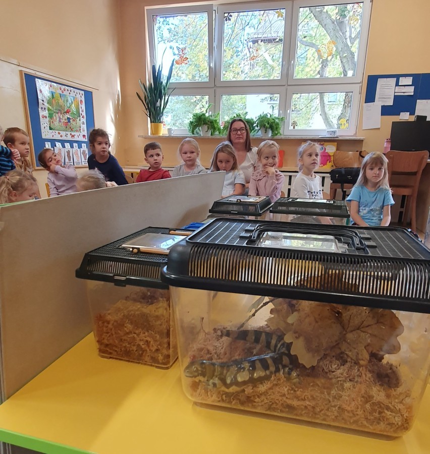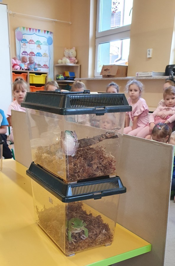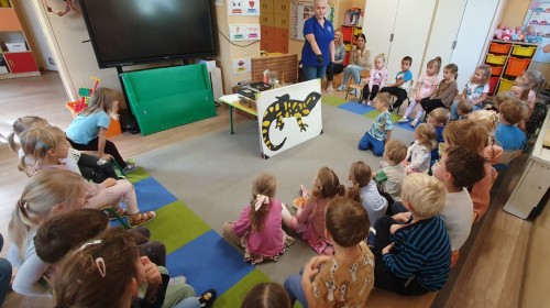 Podczas zajęć prowadzonych przez Panią Magdę przedszkolaki miały okazję zobaczyć egzotyczne gatunki płazów, takie jak rzekotka australijska, drzewołazy, ropucha Agusia, kumak dalekowschodni, salamandra tygrysia oraz traszka. Wśród omawianych gatunków znalazły się płazy z różnych stron świata. Dzieci dowiedziały się, gdzie żyją te zwierzęta, czym się różnią i dlaczego niektóre z nich mają kolorowe ubarwienie. Nauczyły się także rozróżniać płazy bez ogona (np. żaby, ropuchy, kumaki) i z ogonem (np. traszki, salamandry).
