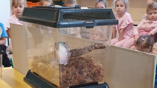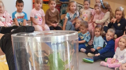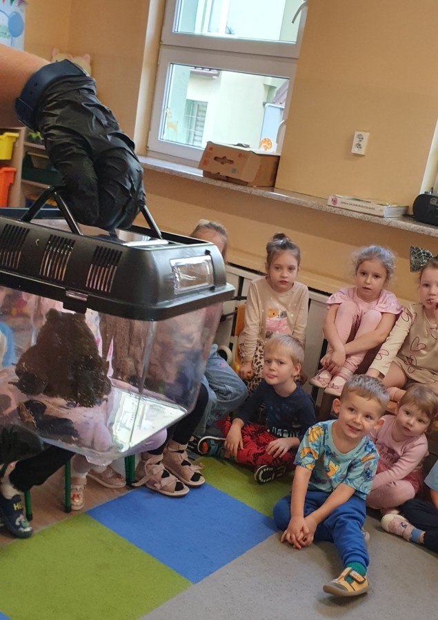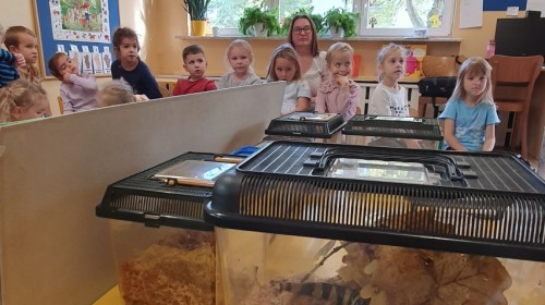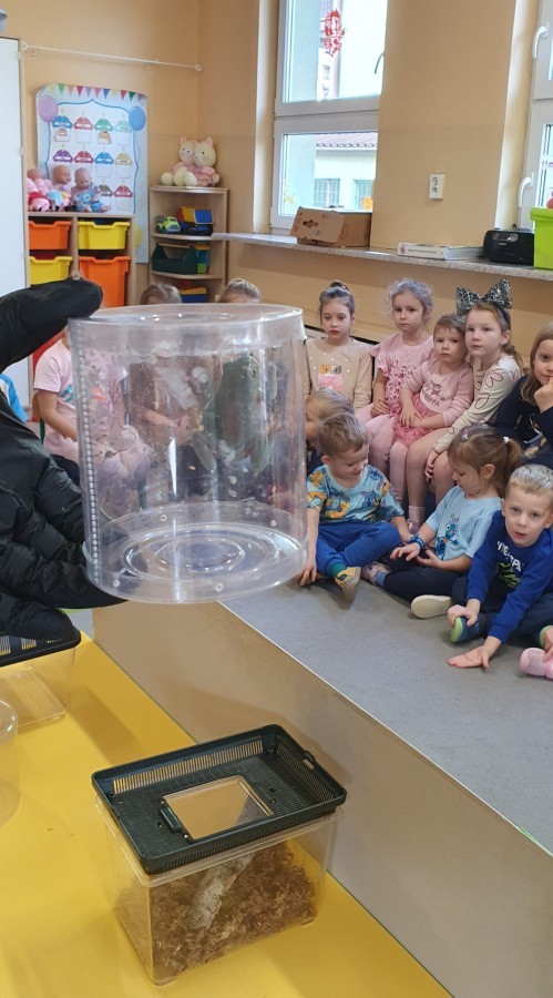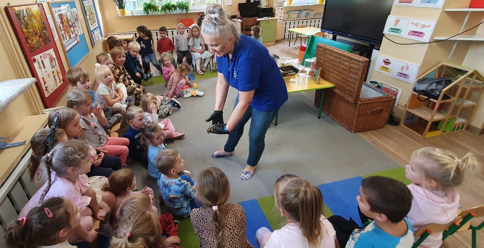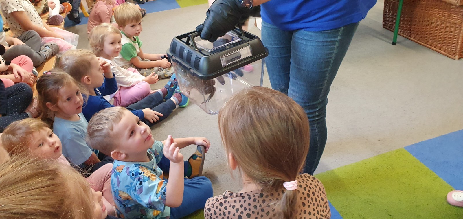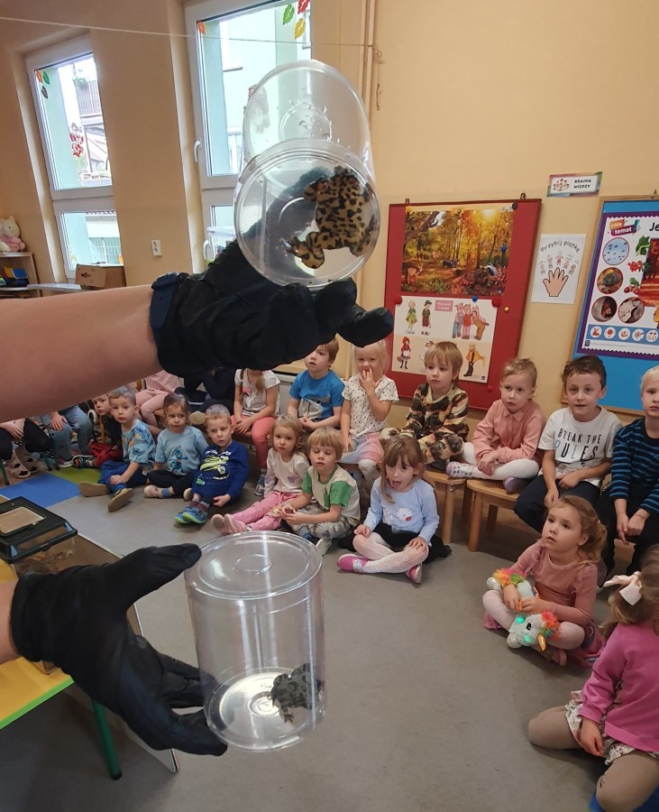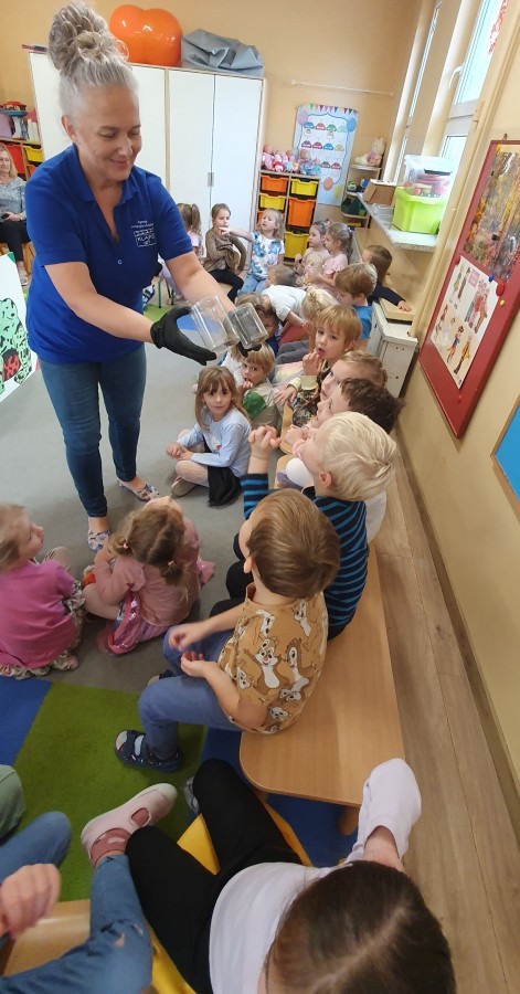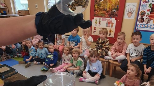 Dzieci były zachwycone możliwością bezpośredniego kontaktu z żywymi okazami i z ogromnym zainteresowaniem słuchały ciekawostek o ich budowie i trybie życia. Spotkanie było nie tylko edukacyjne, ale także inspirujące – rozbudziło w naszych przedszkolakach ciekawość świata przyrody i chęć dalszego odkrywania jego tajemnic.