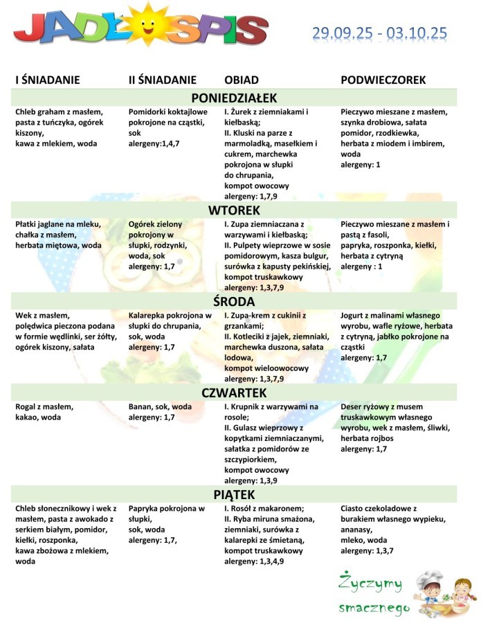 JADŁOSPIS 29.09. - 03.10. 2025